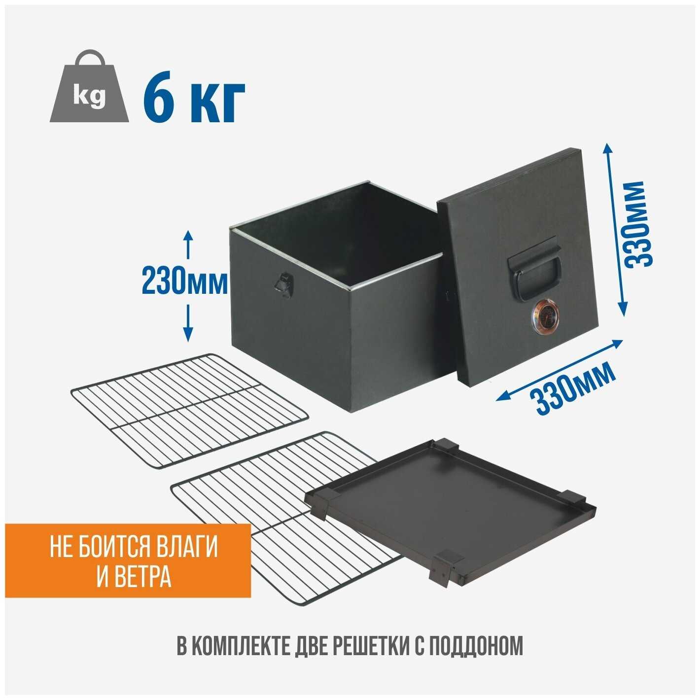 Особенности : | дровница, крыша, крышка, поддон для сбора жира, решетка, термометр |