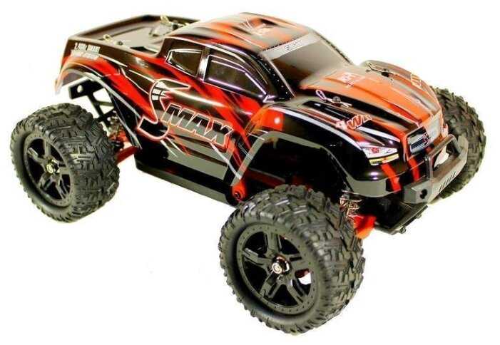 Монстр-трак Remo Hobby Smax Upgrade (RH1635UPG) 1:16. Это действительно машинка с безколлекторным двигателем и некоторыми усиленными элементами подвески (они красного цвета, в из составе нейлон, добавляющий прочности и упругости элементам).