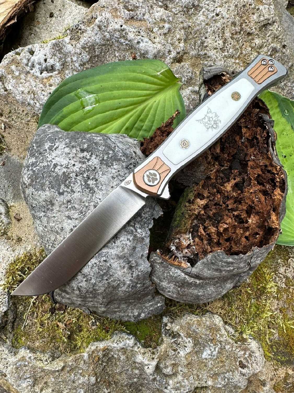 В целом, вид ножа обалденный. Следы лапок на ноже, мордочка кота агрессивная и вставки белого + коричневого хорошо гармонируют.