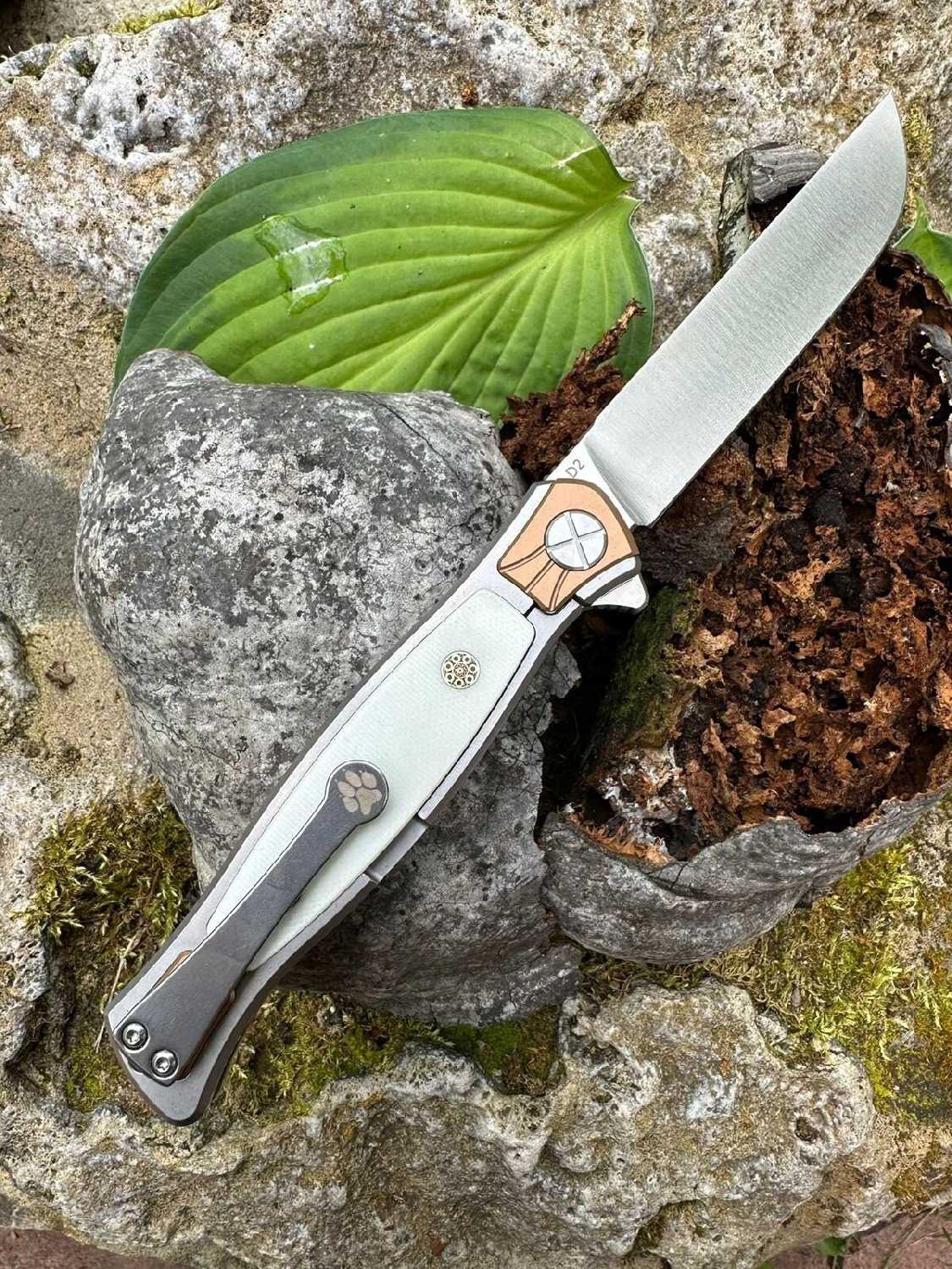 - - Увесистый. Сталь D2. Я бы доплатил, если сделали б сталь клинка 154см (к примеру), а рукоять из титана. Мечты.. мечты..