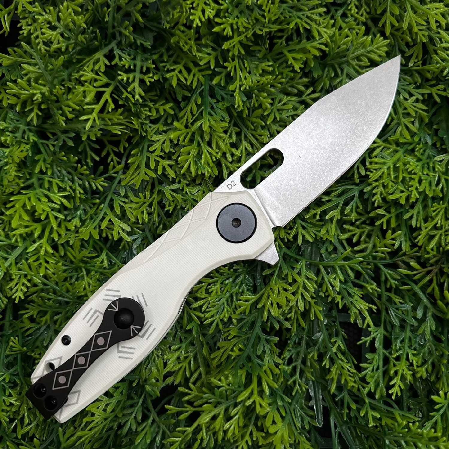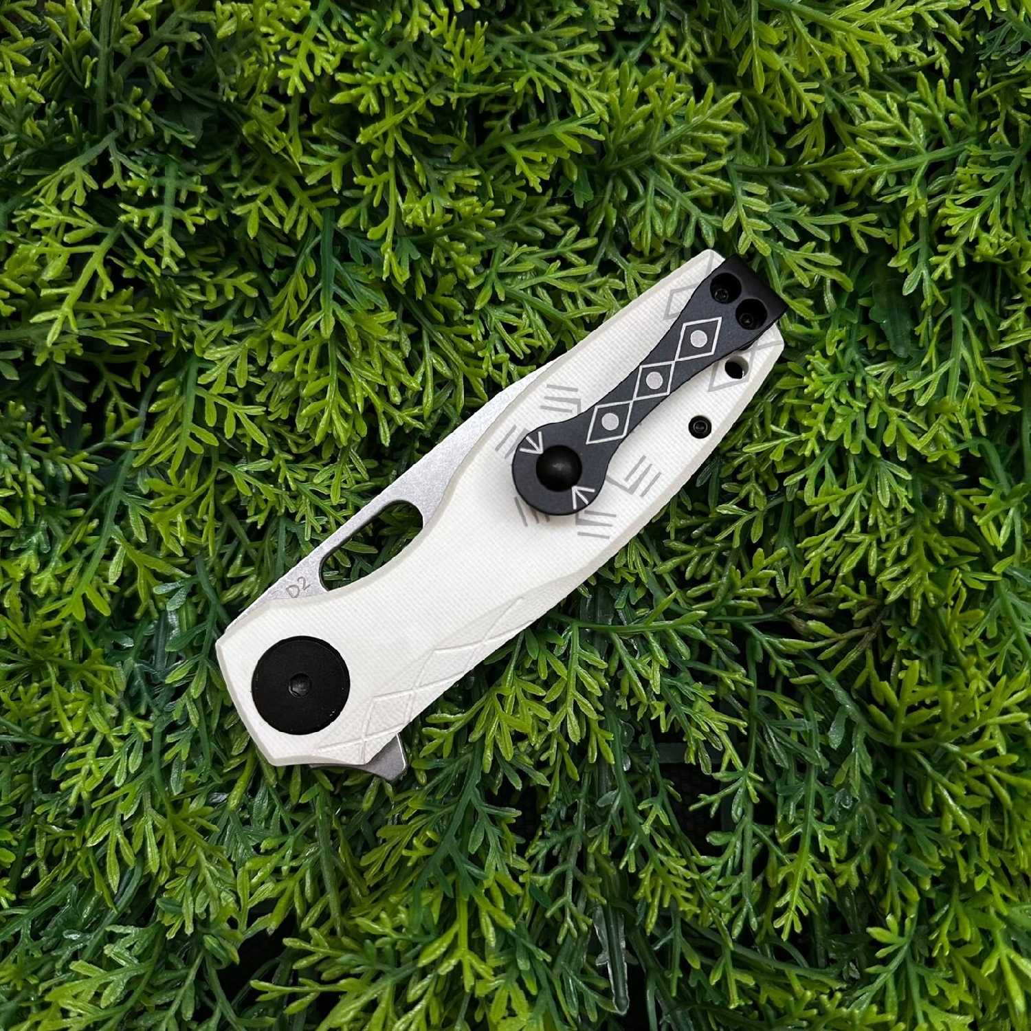 - + Механика открытия из коробки отличная. Заводская заточка приличная. Нож броский, интересное оформление. Клин по центру.