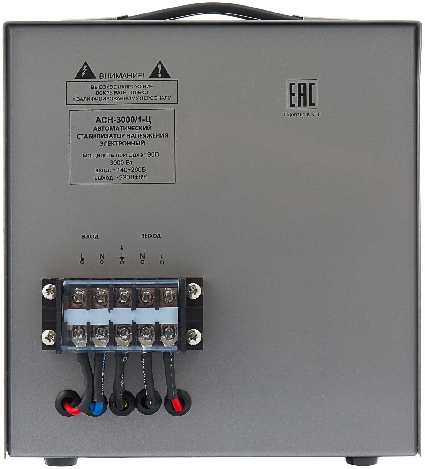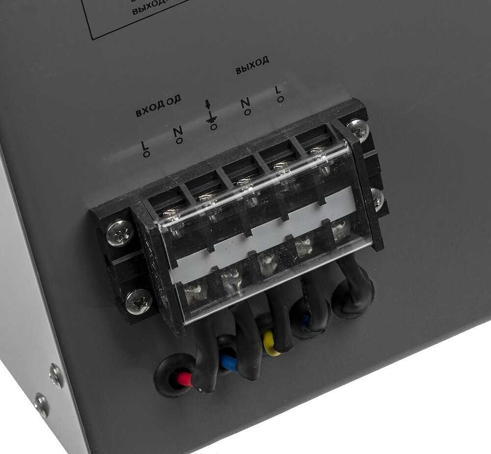 Основной минус — завышенная заявленная мощность: при 3 кВт нагрузки стабилизатор перегревается и отключается, а реальный потолок составляет 2.5–2.7 кВт. Точность стабилизации неидеальна: при входных 180–250 В выходное напряжение может отклоняться до 210–230 В, что заметно по мерцанию ламп накаливания. Разъёмы на клеммной колодке усложняют подключение для новичков, требуя дополнительных вилок или удлинителей. При длительной работе на пределе возможностей корпус нагревается до 45–50°C, хотя это не влияет на функциональность. Для влажных помещений (бани, подвалы) слабым звеном могут стать плата управления и конденсаторы, чувствительные к конденсату.