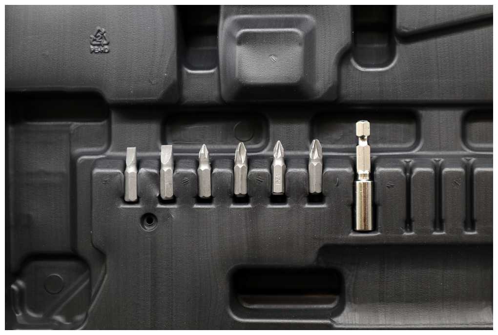 - Кейс с неразделенными отсеками — биты смешиваются с крепежом, увеличивая время поиска нужной оснастки.
