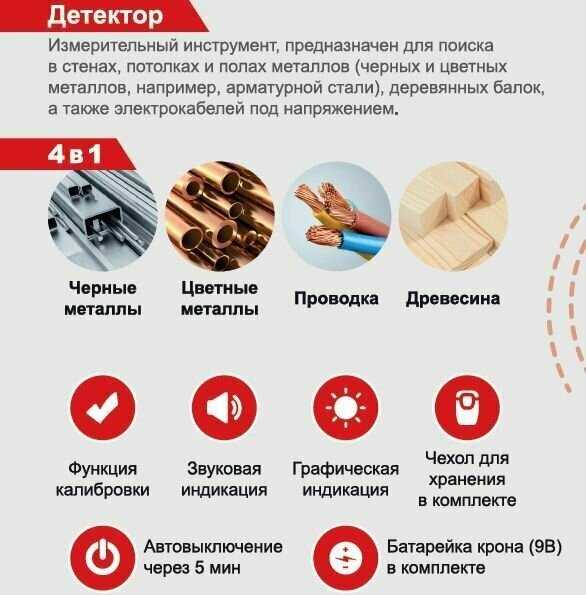 Обнаруживаемые материалы : | электропроводка, цветные металлы, черные металлы, деревянные конструкции |