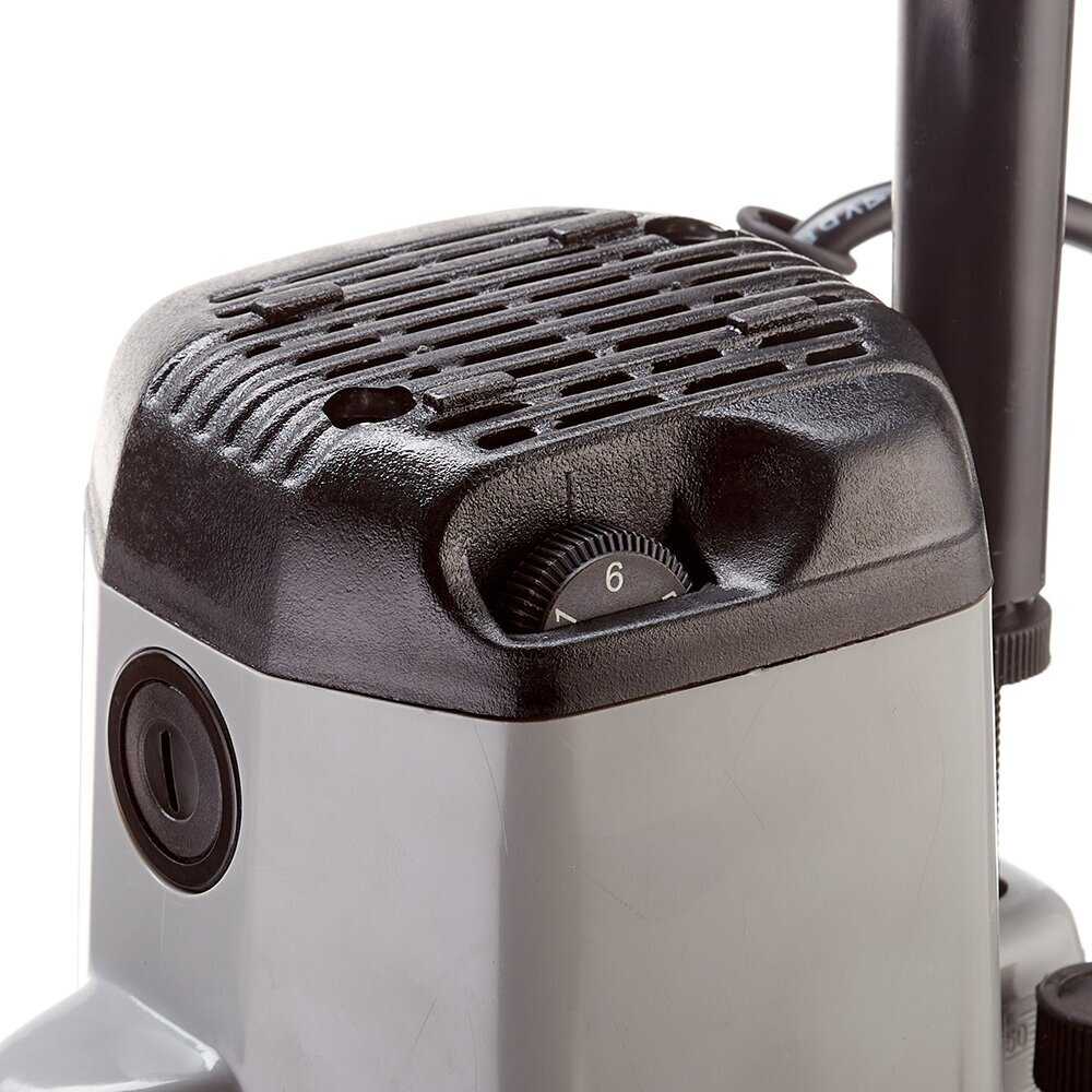 Прорезиненные рукоятки снижают утомляемость при длительной работе и обеспечивают надежный хват, хотя вес инструмента (около 6 кг) ощущается уже через 30–40 минут непрерывного использования. Для стационарного применения в столе это не критично, но при ручной фрезеровке рекомендуется делать паузы. Расположение кнопки включения на корпусе, а не на рукоятке, вызывает неудобства — приходится перехватывать инструмент. Система быстрой смены оснастки с блокировкой шпинделя упрощает работу, однако стопорный механизм часто описывают как тугой, требующий физических усилий. Вентиляционные отверстия эффективно отводят тепло, но при интенсивной эксплуатации нижний подшипник вала может перегреваться.