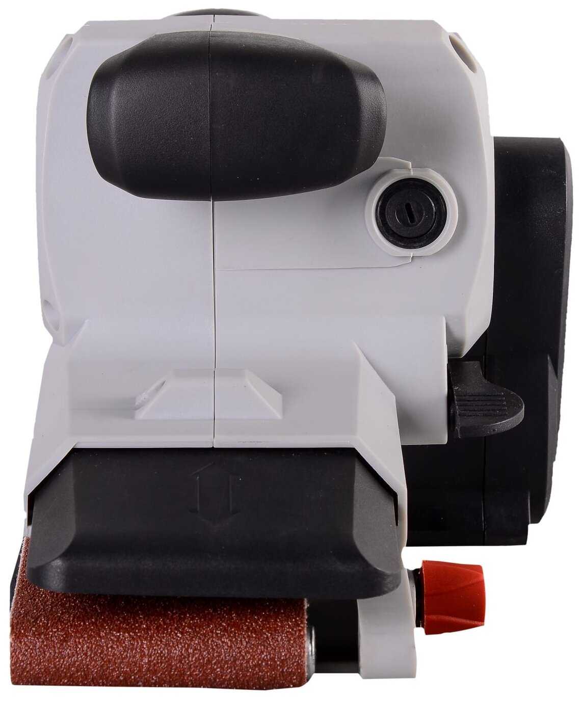 - + Хорошая мощность для своих габаритов, позволяет быстро и эффективно обрабатывать большие поверхности. Удобно, что есть регулятор для центрировки ленты - за счет этого точность работы значительно повышается.