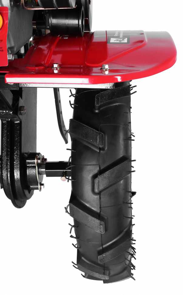 - Колеса диаметром 24.5 см с агрессивным грунтозацепом и массивным протектором предотвращают пробуксовку на влажной и сложной почве, улучшая сцепление.