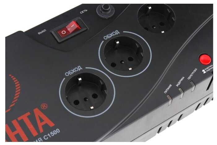 - 5 евро-розеток (3 стабилизированные + 2 в байпас), хватает для ПК с монитором, колонками, холодильника с микроволновкой или ТВ с приставкой.