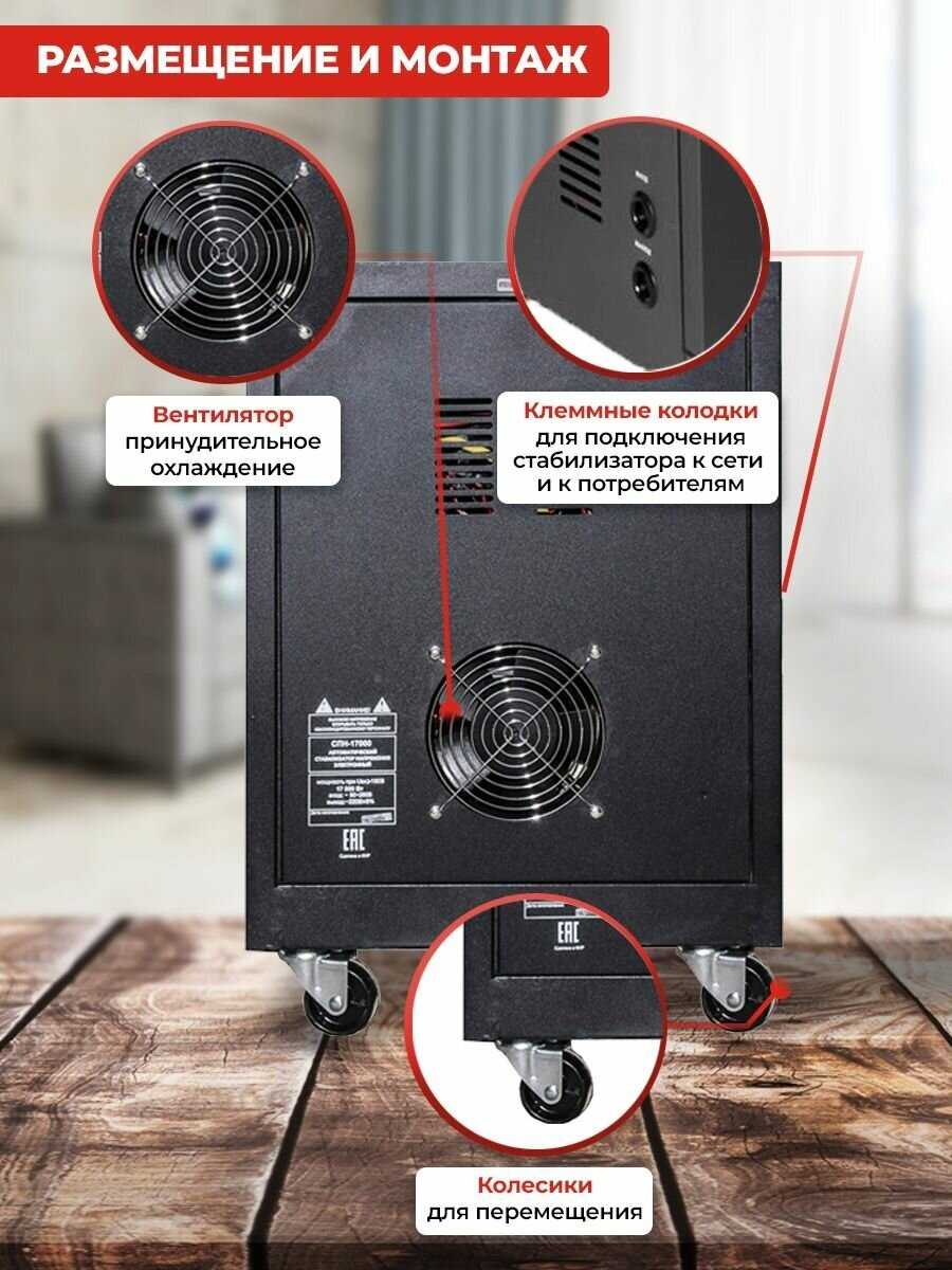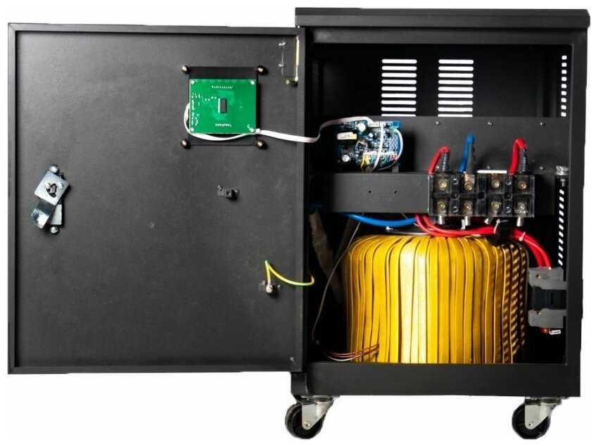 - + Мощный стабилизатор, отлично справляется с перепадами напряжения. Понравилась точность работы - никаких скачков, техника защищена. Удобно, что есть колеса для перемещения.