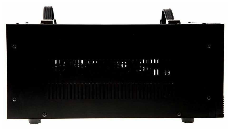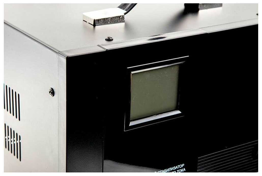 Хороший стабилизатор. Покупался для гаража, для работы 2.2 кВт компрессора и 200 А полуавтоматического сварочного аппарата, периодического включения 3 кВт тепловой пушки. Подключался минуя освещение через 25 А автомат на отдельную розетку. При включении тепловой пушки на полную сеть просаживалась на входе до 125 В, лампочки практически тухли, а стаб. на выходе показывал положенные 220 В. Процент загрузки показал на табло - 50 %. Ток на входе - 20 А.