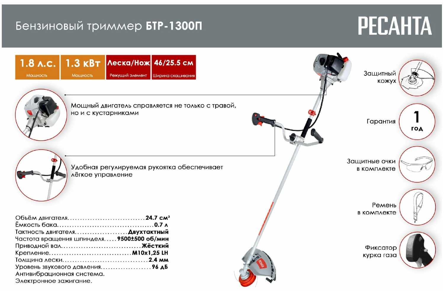 Характеристи РЕСАНТА Триммер бензиновый (БТР-1300П)