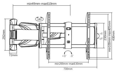 - Кронштейн позволяет поворачивать телевизор на 90° относительно стены, менять угол наклона до 15° и выдвигать его на расстояние до 60 см, что обеспечивает гибкость размещения даже в нестандартных помещениях (например, в трапециевидных комнатах).