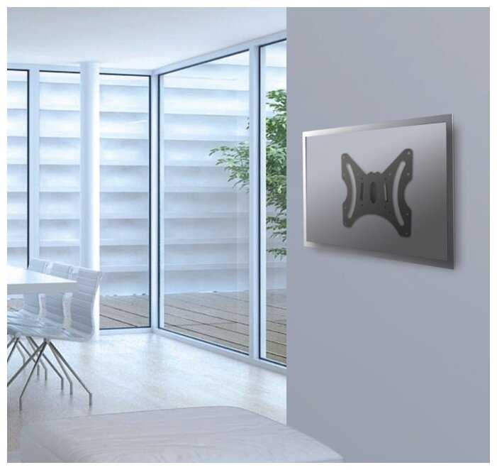 Нормальный качественный кронштейн для телевизора. Взяли в детскую телевизор и этот кронштейн к нему продавец посаветовал. Кронштейнт идеально подошел к телеку, размеры совпали в отверстиях до миллиметра, дополнительно колхозить ничего не пришлось. К стене присверлил - держится надежно, сам точно не отвалится. Телевизор к нему тоже крепится надежно сам не упадет. Кронштейн не регулируется, такой и нужен был, минимум функционала и максимум надежности. Итоговое расстояние от телевизора до стены позволяет вставить жесткий диск и подключить интернет, но на самом деле расстояния немного, эстетично смотрится.