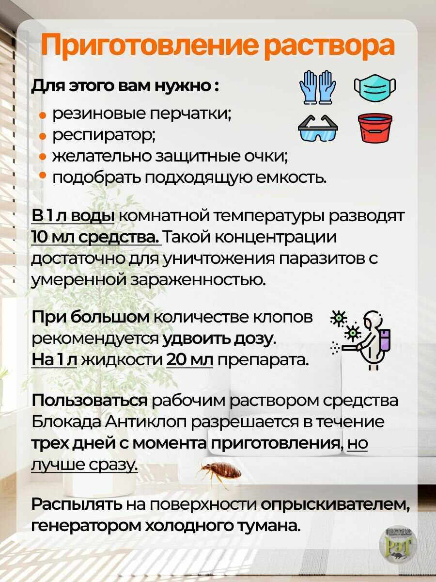 | Способ применения : | Перед применением необходимо убрать из помещения домашних животных, убрать в шкафы продукты. Обязательно соблюдать меры предосторожности и следовать инструкции. Раствор разводится с водой ( смотрите инструкцию), можно использовать как спрей от клопов или наносить кистью, если насекомых много. Необходимо тщательно обработать все возможные места обитания клопов: изнанку ковров, плинтуса, под подоконником, за батареей и тд. После нанесения, распыления средства от клопов -нужно проветрить помещение 30мин. Влажную обработку проводить не ранее, чем через 24ч. Если насекомых очень много, то нужно провести повторную обработку через 6-7дней. |