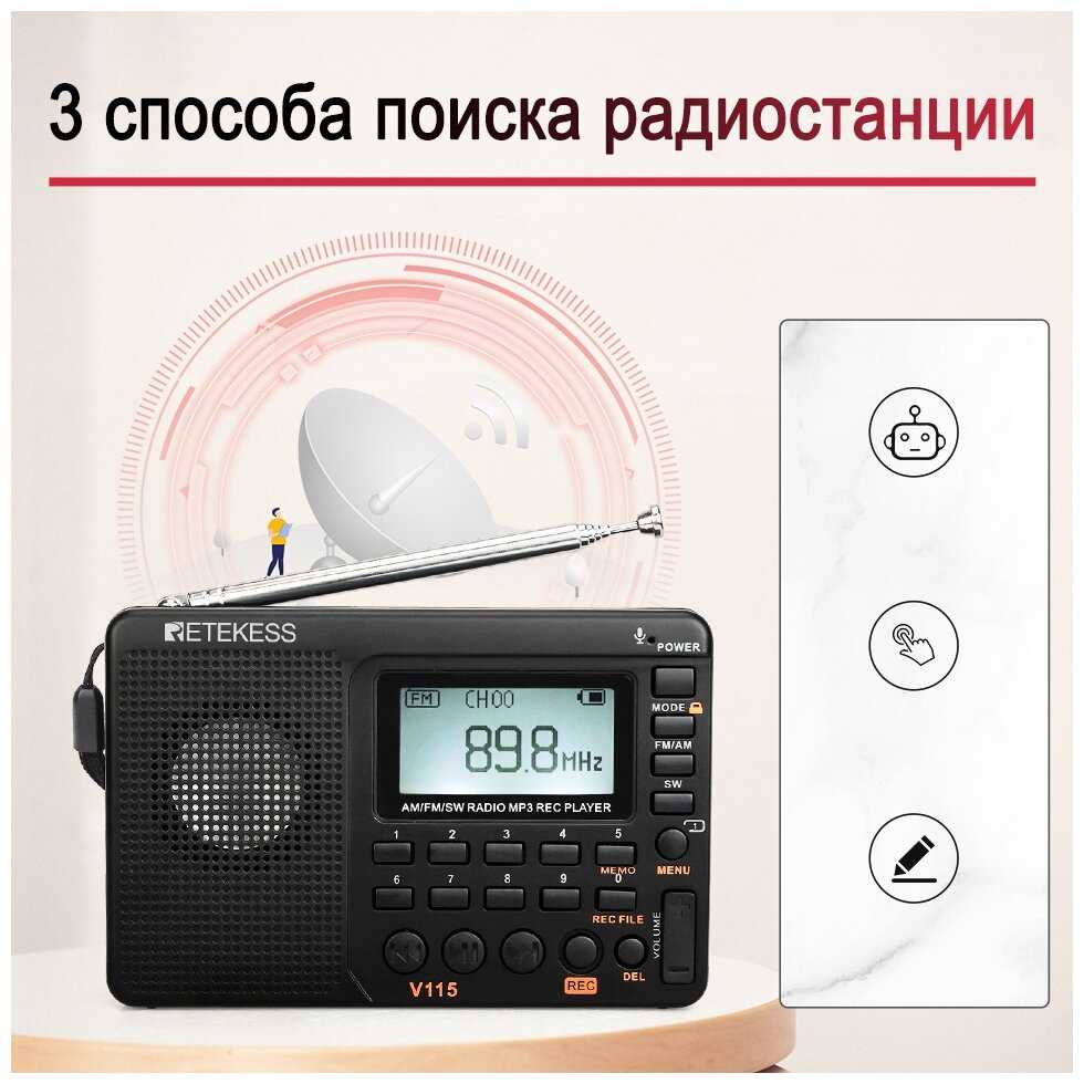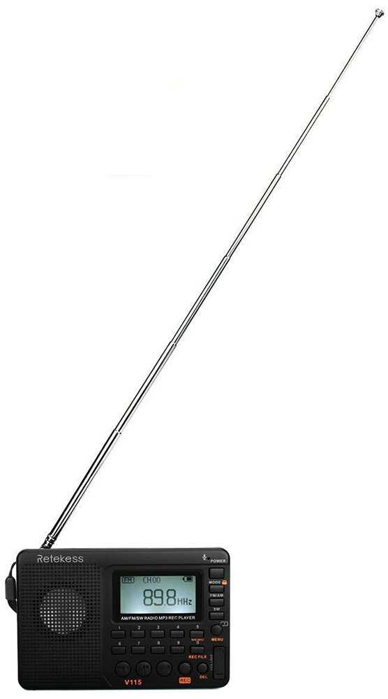 - + Приемник Retekess V115 известная марка китайской фирмы по производству электроники. Хороший прием радиостанций. Хороший звук и громкость для такой малышки. Возможность прямого выбора радиостанции через набор частоты. Большое количество станций в памяти, сохранение памяти без аккумулятора. Аккумулятор достаточно распространен (от сотовых телефонов). Информативный и в то же время не перегруженный индикатор. Приемник покупался в основном как FM-радио, но в дальнейшем возможно буду использовать как плеер и диктофон.