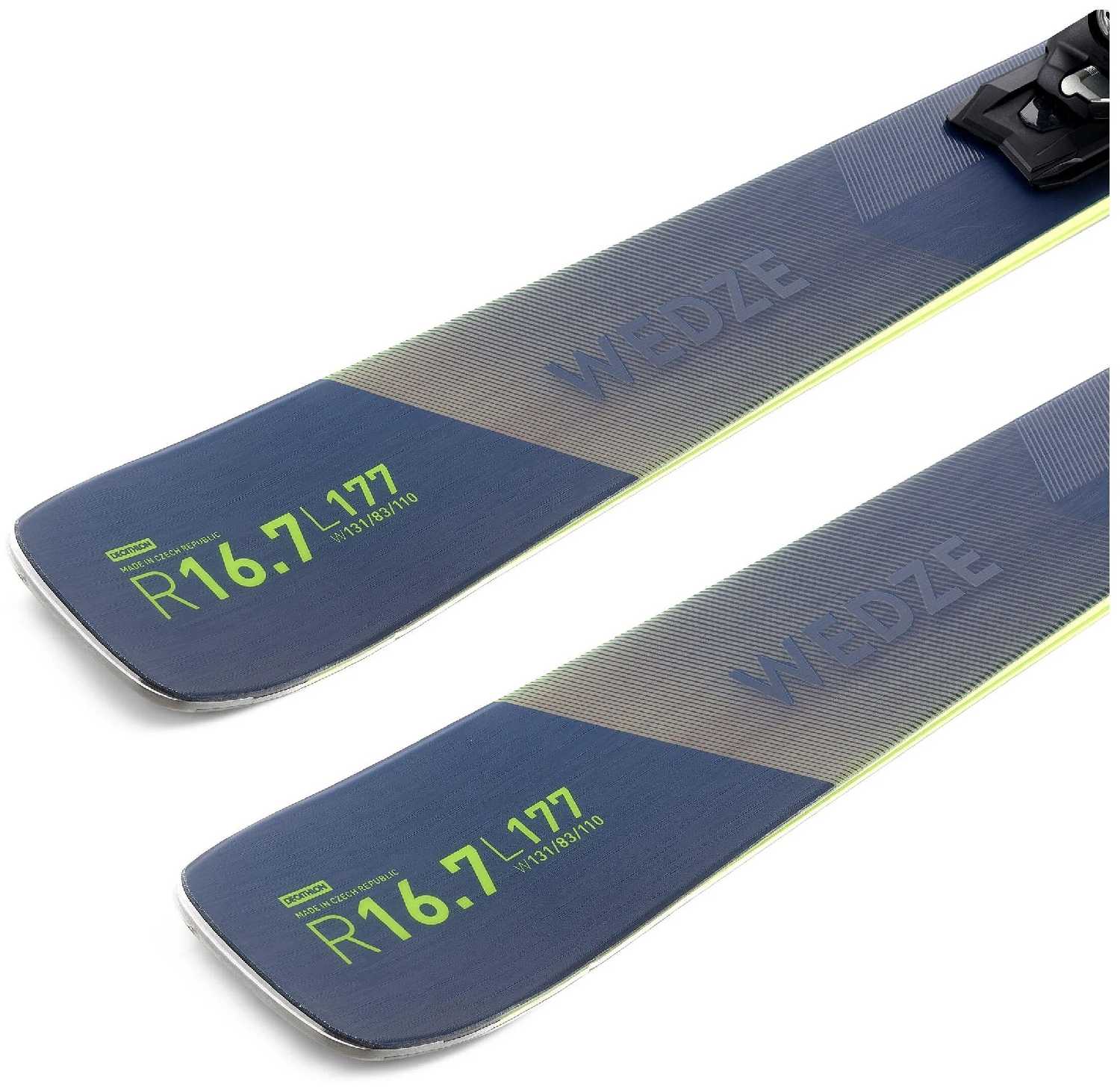 На радиус поворота влияет ширина носка, талии и пятки лыжи. Обычно радиус измеряется в метрах. Чем уже талии лыжи относительно носка и пятки, тем короче радиус поворота, и тем глубже боковой вырез. Лыжи с глубоким боковым вырезом (коротким радиусом поворота) поворачивают быстрее, а лыжи с небольшим боковым вырезом (длинным радиусом поворота) поворачивают медленнее, но они обычно более устойчивые на высоких скоростях.