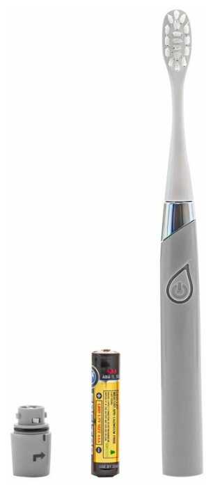 Работает от мизинчиковой батарейки ААА, она была уже вставлена в щётку. Можно брать в поездку, не нужно искать розетку для зарядки аккумулятора.