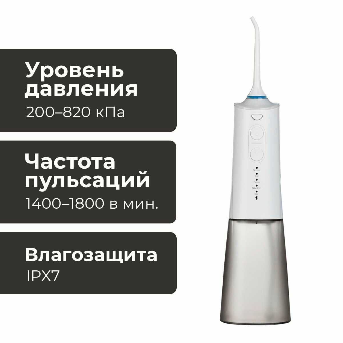 - Давление от 210 до 820 кПа обеспечивает глубокую чистку без повреждения десен, улучшая свежесть полости рта по сравнению с щеткой или нитью.