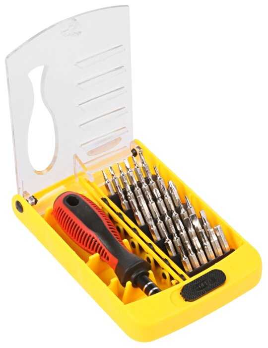 Купил такой набор для ремонта стиральной машинки. Набор оказался очень большим, аж 37 элементов. Сама отвертка хорошая, с удобной ручкой. Очень много различных насадок для работы, мне понадобилось всего лишь две. Насадки надежно прикреплялись к самой отвертке. Материал насадок прочный, металлический, вроде как из стали. Обрадовал пластиковый кейс для хранения всех насадок, чтобы не растерять их при первом же использовании. Набор имеет отличную цену, за такое количество можно было брать и больше. Всем доволен, рад приобретенному товару, всем советую!