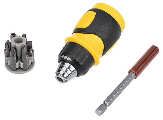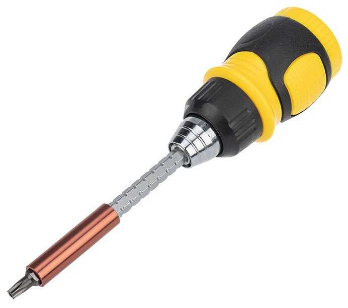 Короткая "ухватистая" рукоятка, вполне достаточный набор бит, которые всегда с собой, жёсткая регулировка вылета удлиннителя.
