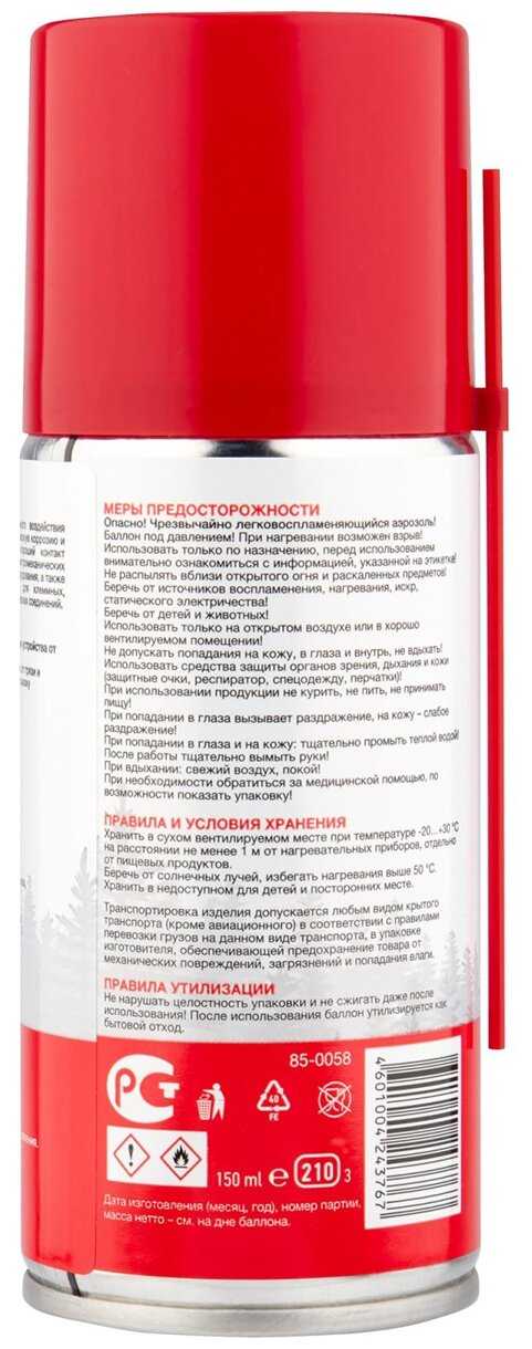 Состав : | алифатический растворитель >30%, минеральное масло >30%, углеводородный пропеллент 15-30% |