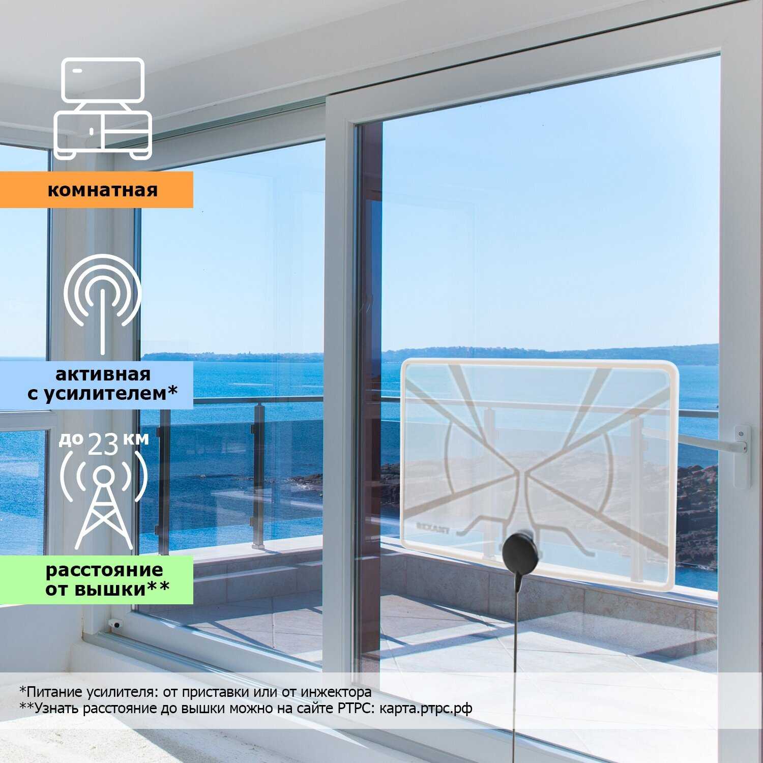 - + Хороший уверенный прием 20 каналов. Приклеена в углу окна.