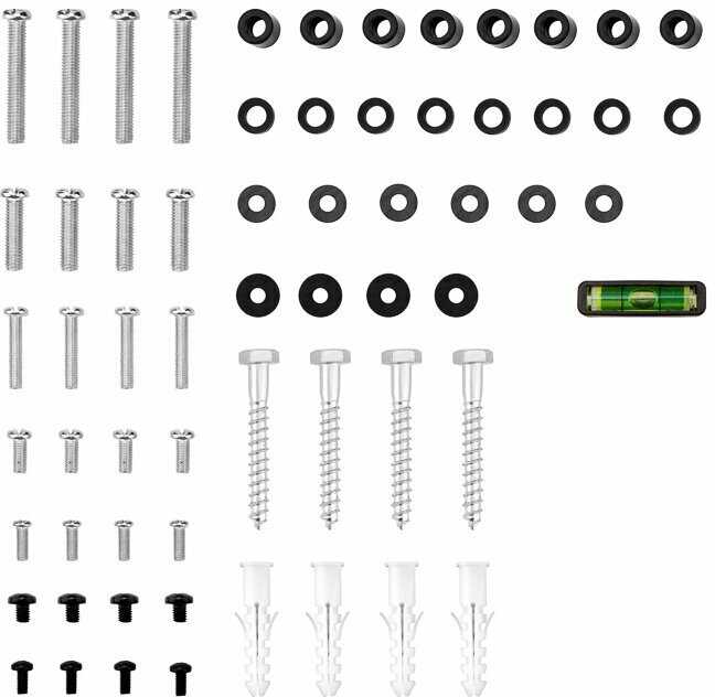 - + Просто вешается. Уровень в комплекте. Выглядит довольно прочно. В комплекте болтики для разных тв разных диаметров.