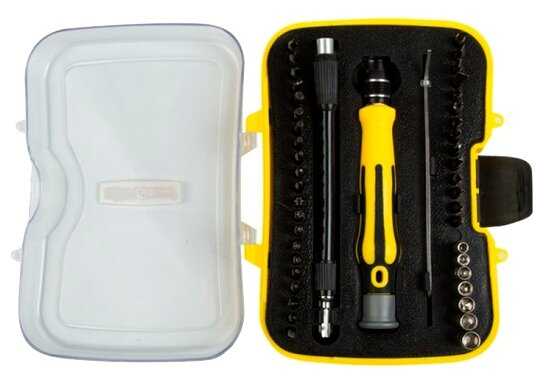 | Дополнительная информация : | Отвертка, Гибкий удлинитель, Пинцет, Биты 42 шт.: Т3 Т4 Т5 Т6 Т7 Т8 Т9 Т10 Т15 Т20, H 0.9 H 1.3 H 1.5 H 2.0 H 2.5 H 3.0 H 4.0, Pentalobe 08, SL1.0 SL1.5 SL 2.0 SL2.5 SL3.0 SL3.5 SL4.0, PHOOO PHOO PH0 PH1 PH2, ^ 3.0, U2.6, ? 1.5, ? 0 ? 1 ? 08, М2.5 М3 М3.5 М4 М5 М5.5 |