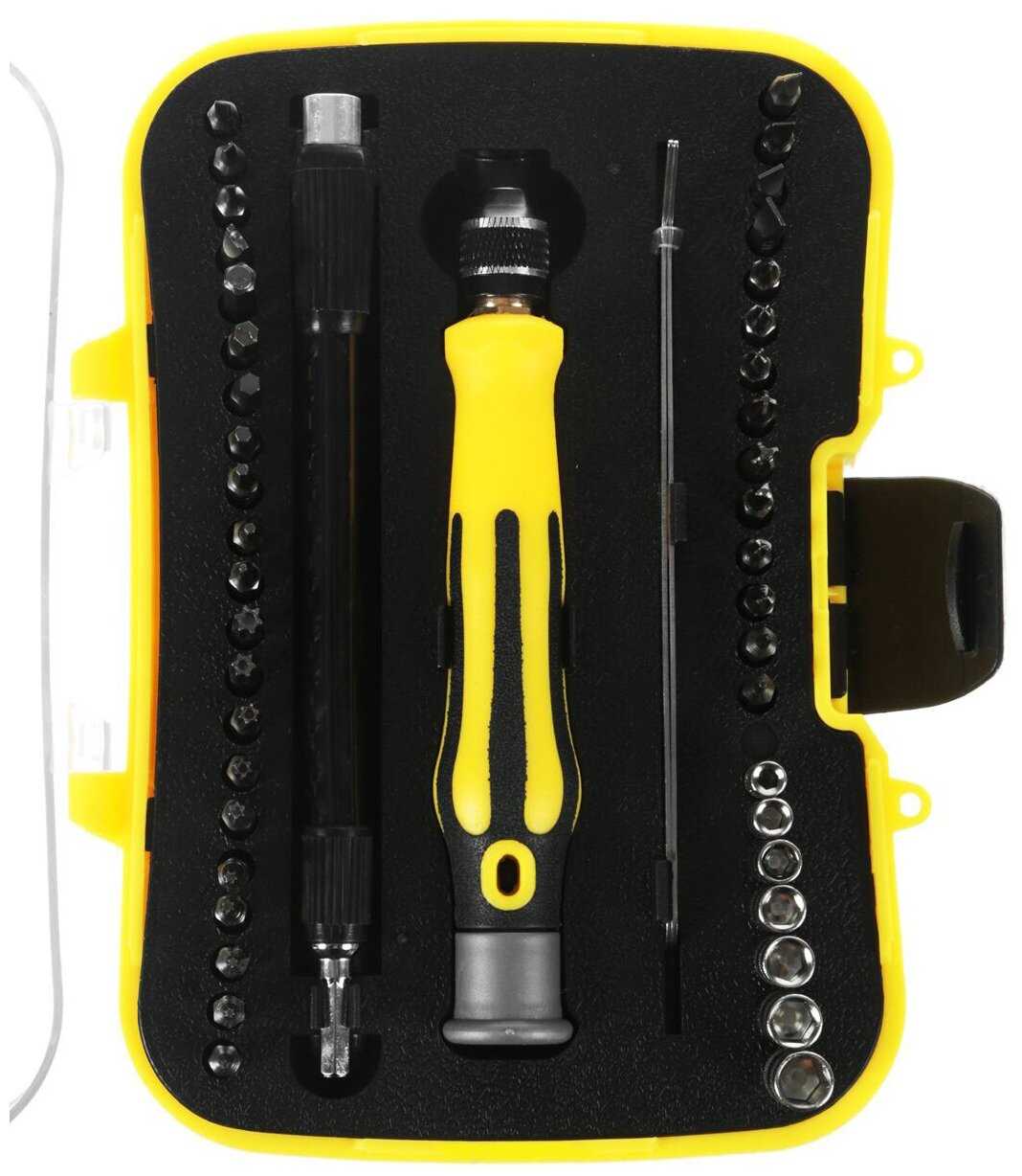 - + Хромованадиевая сталь, комплектация 45 предметов , рукоятка не скользит в руке при работе