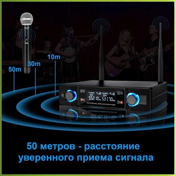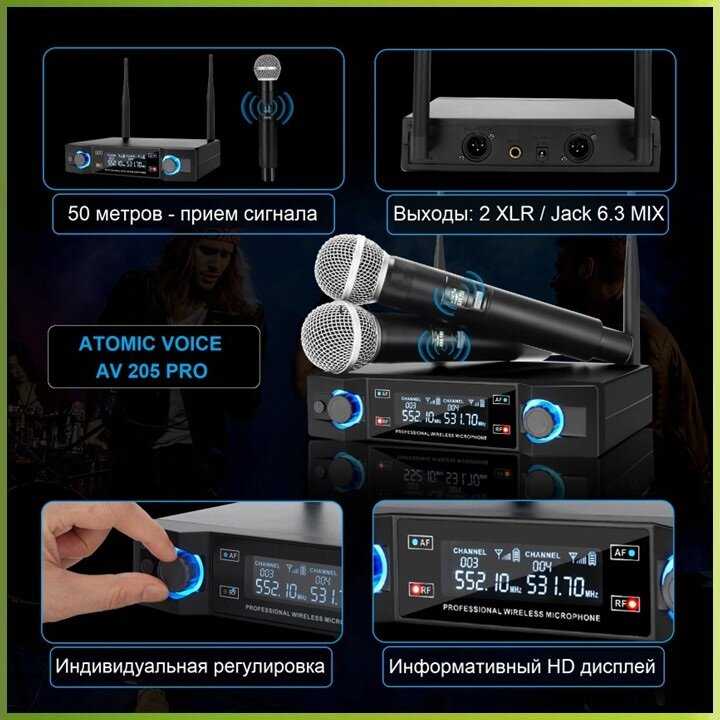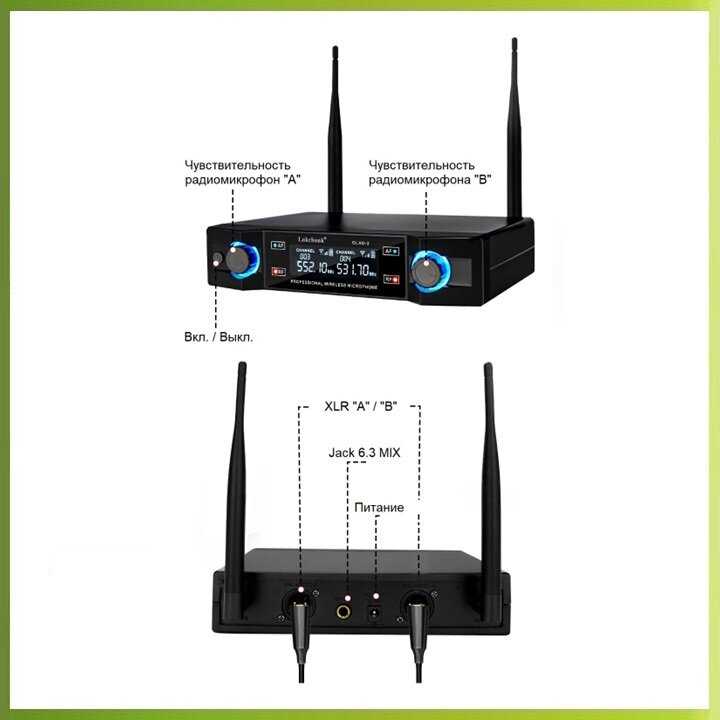 Подробная комплектация : | База/Приемник сигнала - 1шт, Беспроводной микрофон - 2шт, Антироллеры (защита от скатывания) - 2шт, Адаптер питания - 1шт, Микрофонный кабель - 1шт |