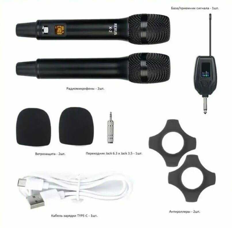 Подробная комплектация : | Компактная аккумуляторная база/приемник сигнала - 1шт, Ручные радиомикрофоны - 2шт, Кабель зарядки (Type-C x USB) - 1шт, Ветрозащита - 2шт, Антироллер (защита от скатывания) - 2шт, Инструкция на русском языке - 1шт |