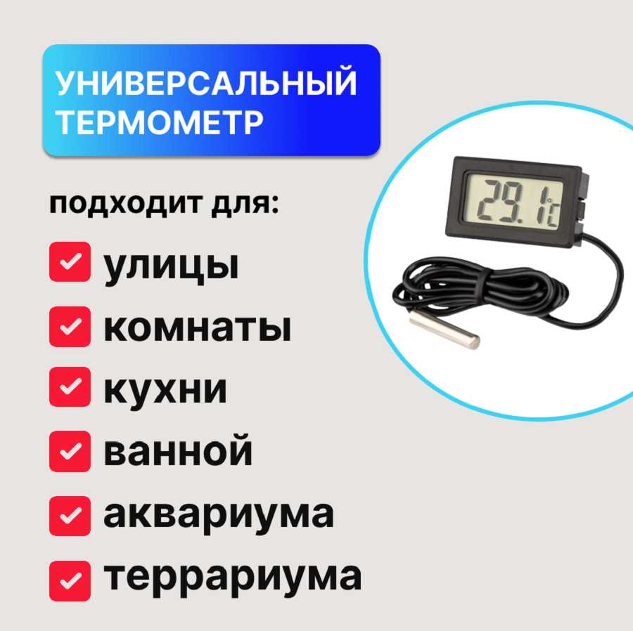 Прибор состоит из компактного основного блока с ЖК-дисплеем и выносного датчика на проводе длиной примерно 1 метр. Провод отмечается как достаточно жесткий, что для стационарного крепления некритично, но может быть неудобно при монтаже. Длина провода в 1 метр подходит для многих сценариев (например, вывести датчик за окно, оставив дисплей внутри), но некоторым пользователям явно не хватает большей длины для специфичных мест установки. В комплекте обычно идет двусторонний скотч для крепления как основного блока, так и датчика, который, по отзывам, держится хорошо. Отсутствие подсветки дисплея затрудняет чтение показаний в темноте. Крепление самого дисплея иногда вызывает сложности – пользователи отмечают, что при попытке его приклеить или нажать, показания могут сбрасываться или моргать, хотя потом восстанавливаются.