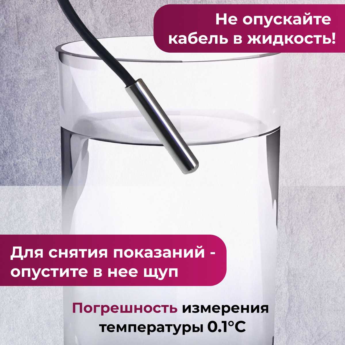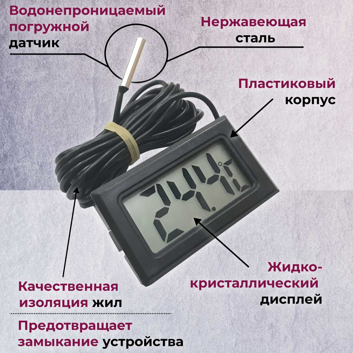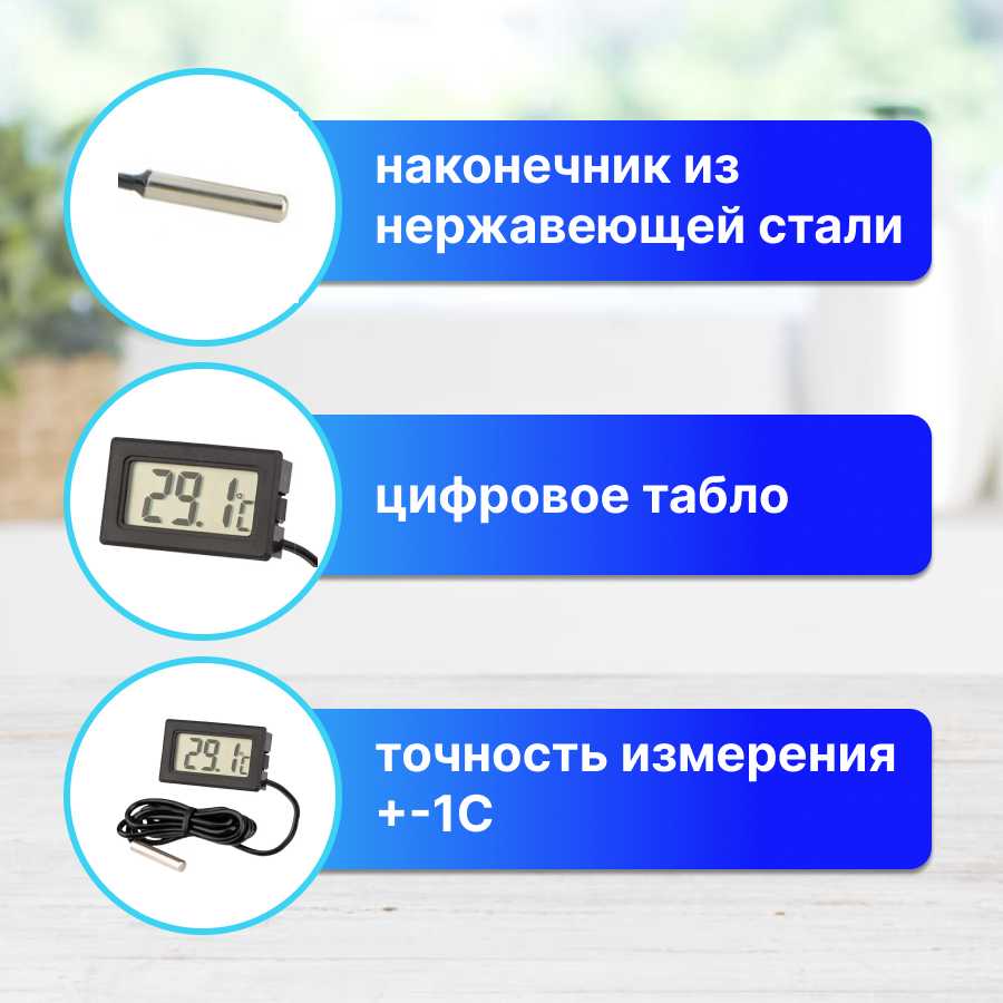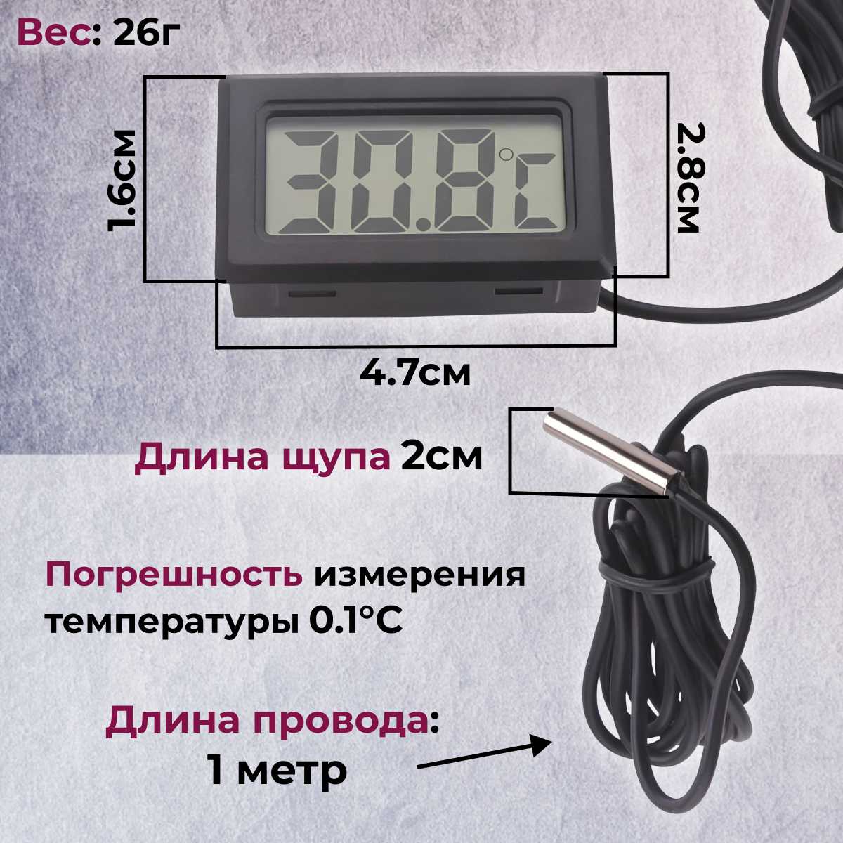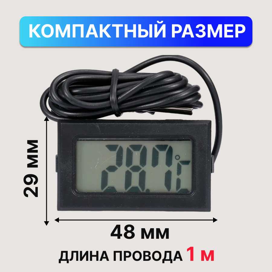 Габариты термометра крайне малы: по отзывам, корпус составляет примерно 4,5×2,5 см, а весь комплект с проводом помещается в спичечный коробок. Это удобно для скрытого монтажа, но цифры с расстояния 2 метра видны не всем — некоторые пользователи отмечают необходимость подходить ближе или брать устройство в руки. -