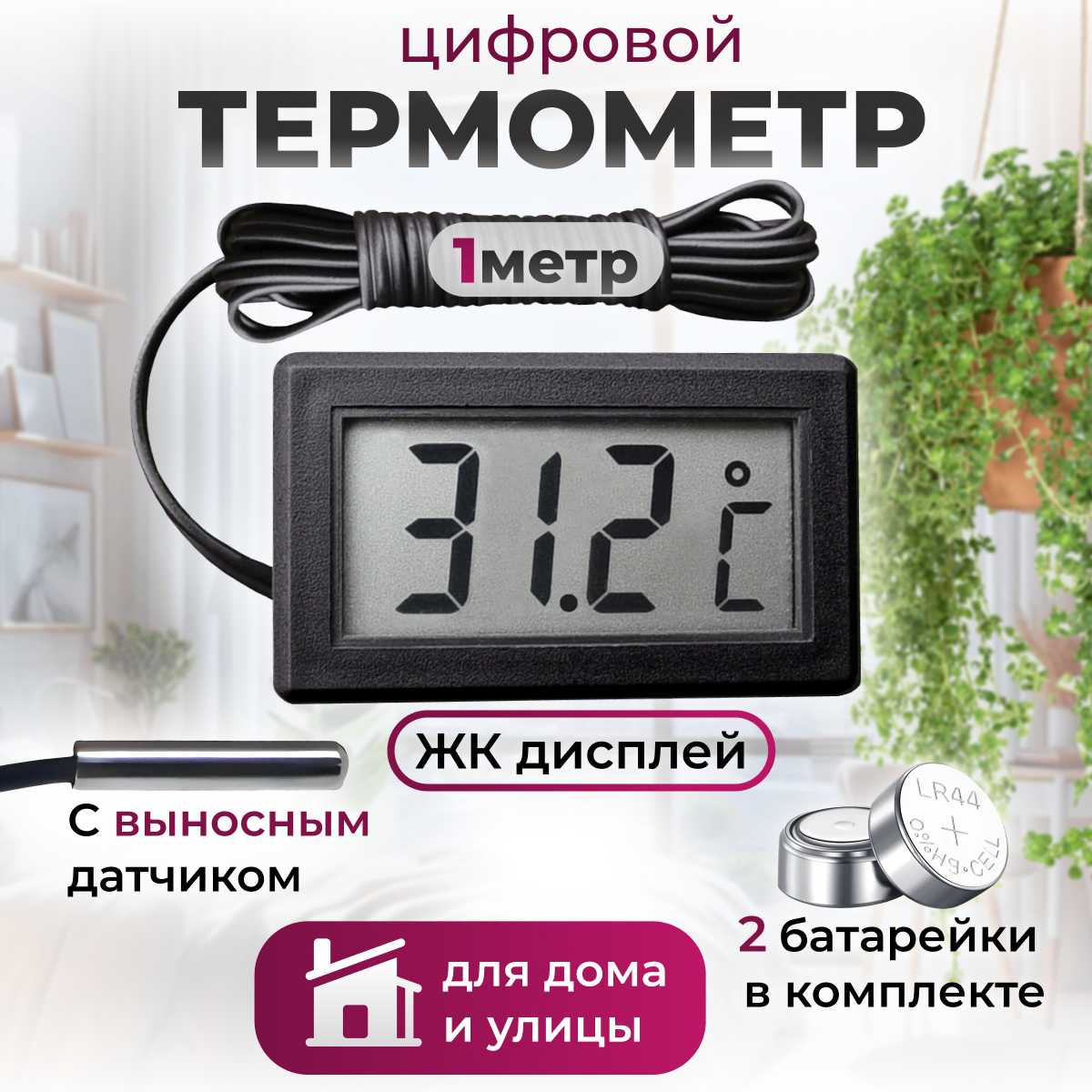 - Кабель длиной 1 метр позволяет выводить сенсор за окно при расположении дисплея внутри помещения.