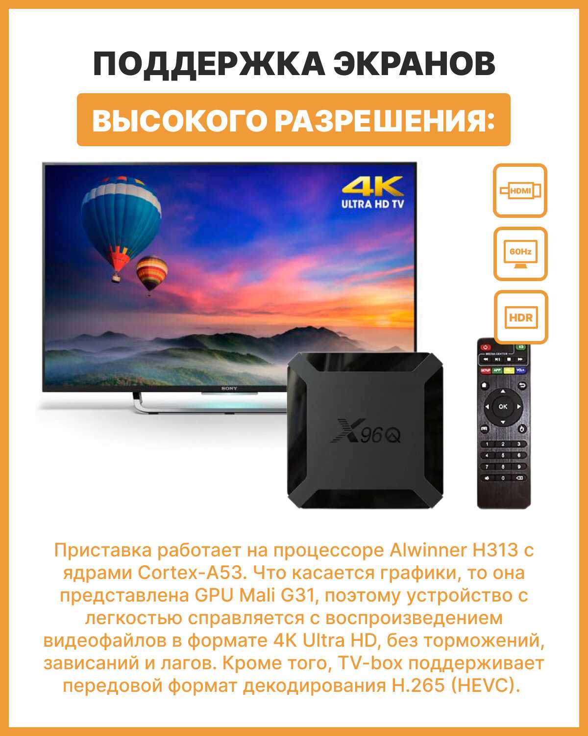 - Подключение осуществляется через стандартный HDMI-разъем, что обеспечивает совместимость с большинством телевизоров.