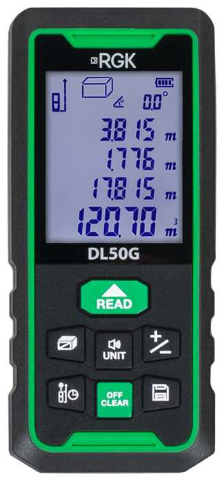 RGK DL50G — это профессиональный лазерный дальномер с уклоном на домашнее и полупрофессиональное использование. Его ключевое преимущество — сочетание точности (2 мм на 5 м) и видимости зеленого луча, который превосходит красные аналоги при работе на улице. Прибор идеален для замеров в помещениях: расчет площади стен под поклейку обоев, определение объема комнат для установки климатической техники, разметка перегородок. Встроенный угломер с калибровкой полезен при монтаже кровель или лестниц, а режим Пифагора позволяет измерять высоту объектов без стремянки.