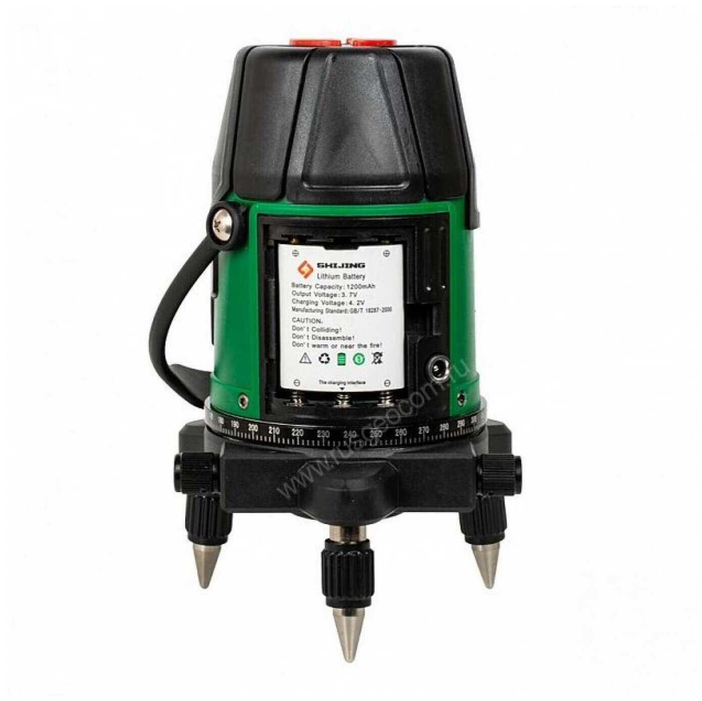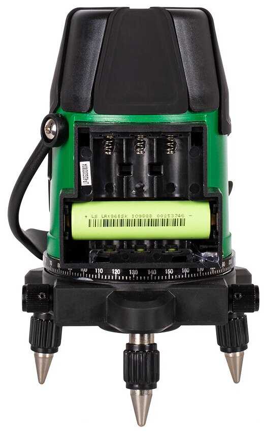- + Удобный. Компактный. Зеленый луч. 5 линий. Низкая погрешность. В комплекте есть зарядник и защитные очки - необходимая вещь, чтобы глаза не повредить. Можно выбрать варианты питания - 3 аккумулятора или батарейки, при этом можно запитывать вообще от сети. На аккумуляторах, не выключая, можно проработать 4 часа. Очень простой в использовании, можно разобраться и без инструкции. Дальность действия 30 метров - для дома вариант оптимальный. Погрешность практически незаметная - всего 0,2 мм на 1 м.