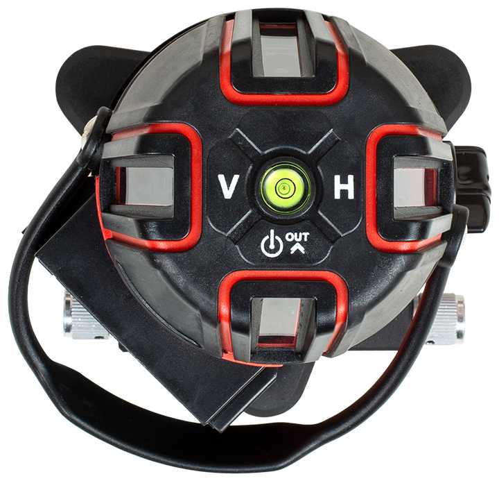 Блокировка активируется при выключенном приборе зажатием кнопки переключения лучей (обозначена как «OUT»). После включения маятник фиксируется, позволяя проецировать диагонали. Важно разблокировать систему после работы, иначе возможна расфокусировка юстировки. Переключатель на корпусе не подписан, что вызывает путаницу: одно положение включает самовыравнивание, другое — блокировку и отключение. -