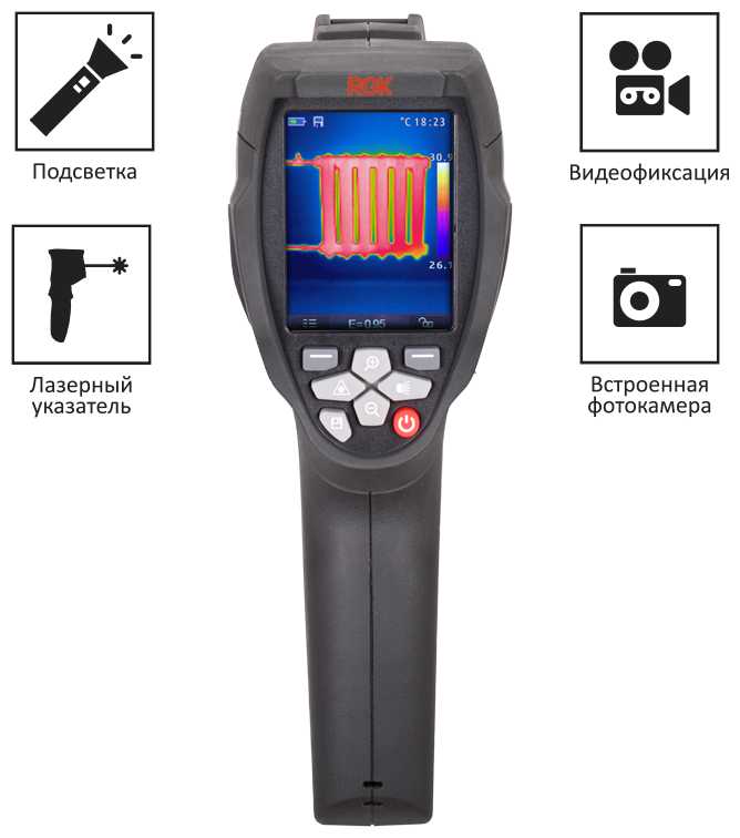 - + Подсветка, лазерная наводка, меню на русском языке. В комплекте есть фурнитура для записи комментариев во время съёмки. Есть резьба под штатив. По функционалу: 4 варианта отображения картинки, особенно понравился режим совмещения обычного изображения с инфракрасным - сразу можно определить место неполадки. 2 диапазона измерения: от -20 до +160 или от 0 + 350. Снимает фото и видео, которые можно сохранять на карту памяти.