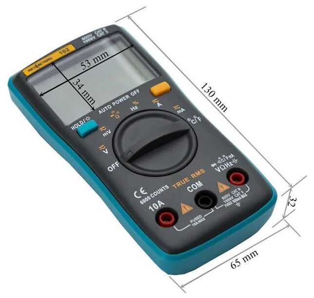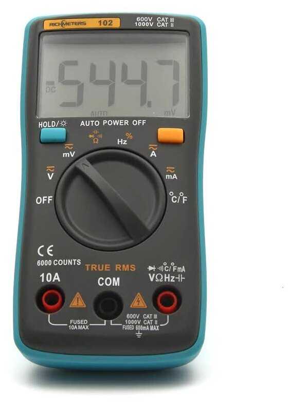 - + Компактный цифровой мультиметр Richmeters RM102, питание на двух батарейках ААА, большой яркий экран с крупными цифрами и хорошей подсветкой, надёжные мягкие щупы, измеряет температуру внутренним датчиком и с помощью термопары, авто выключение через 15 минут, имеется разъём калибровки на плате, два защитных предохранителя внутри (нестандартная длина на 10 А и 600 А), возможность устанавливать вертикально на заднюю опору, мануал на английском, есть все заявленные функции.