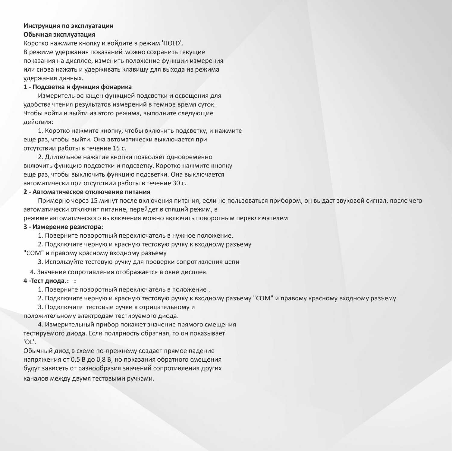 | Особенности : | автоматический выбор диапазона измерений, автоматическое выключение, магнитный чехол, подсветка дисплея, фиксация измерений, фонарик |