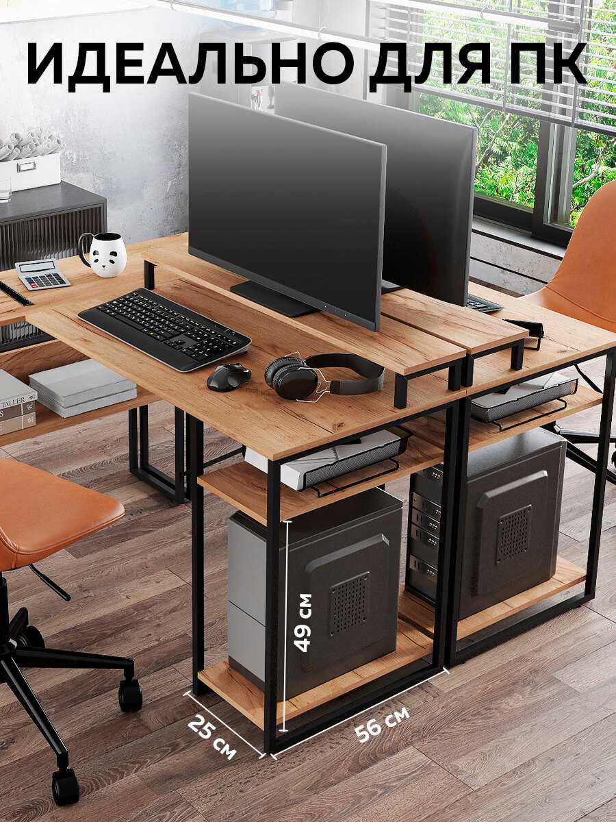 Идеален для простого офиса или рабочего кабинета – много места для ПК, ТВ с консолью, принтера, боковая зона для доп. задач. Устойчивый металлический каркас держит вес, компактно использует угол. Для одного пользователя за ПК глубина маловата, но с ноутбуком комфортно. -