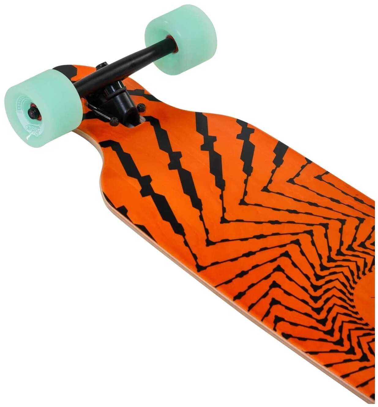 - + Отличная доска, неплохие колеса, траки среднего уровня. С небольшой горы можно уверенно ехать, никаких срывов, лонг держит дорогу отлично)