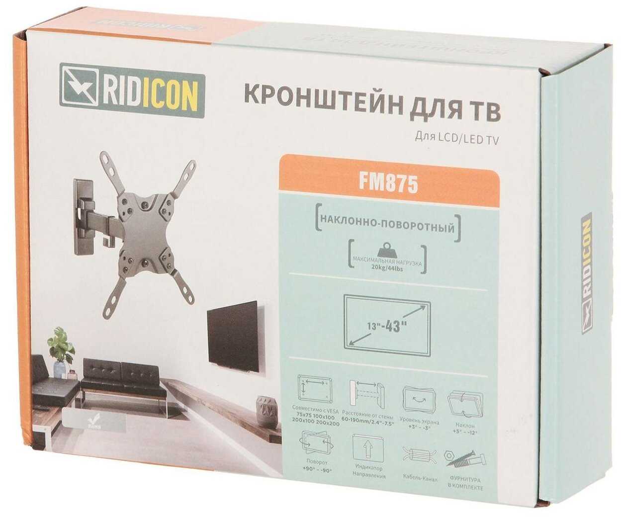 При выборе телевизора, встал вопрос и о покупке Кронштейна для телевизора Ridicon FM875 Black и наш выбор стал. Очень компактный,быстро собрали, очень надёжно крепится. Главное все очень надёжно, и телевизор не занимает много места. Однозначно рекомендую к покупке.