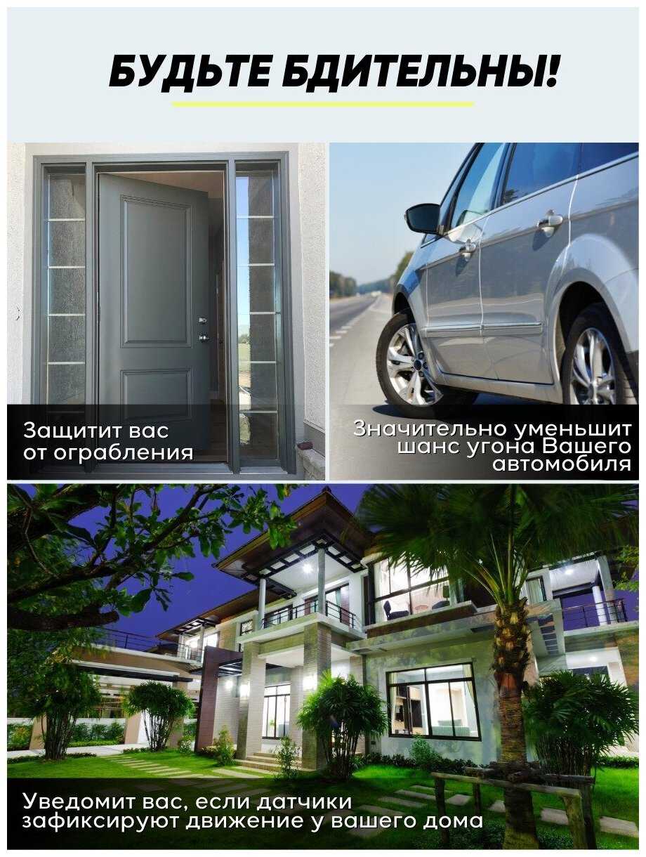 - Датчик PIR с радиусом 8 метров фиксирует движение людей, игнорируя мелких животных (чувствительность регулируется).