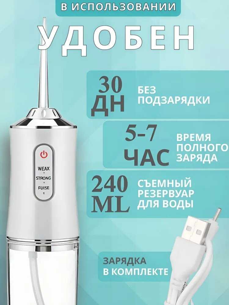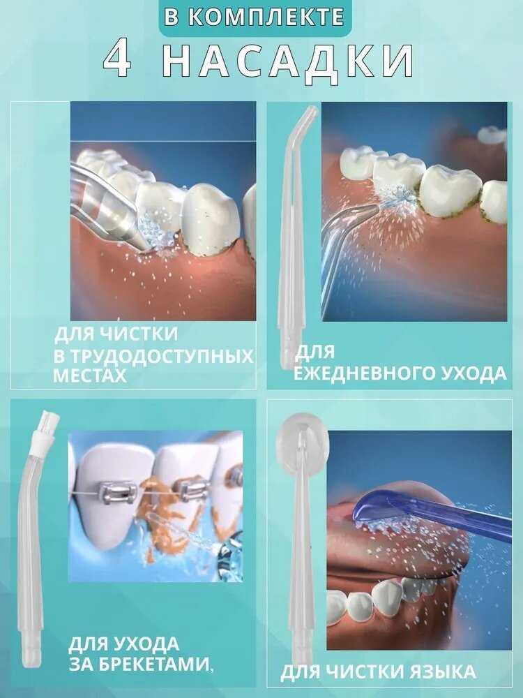 Портативность и длительное время работы без подзарядки делают прибор удобным в поездках. Четыре насадки в комплекте позволяют подобрать оптимальный режим, а мощная струя эффективно очищает труднодоступные места в полости рта. Пользоваться комфортно и просто.