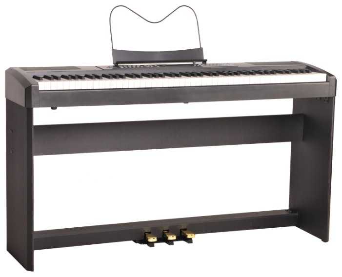 - Встроенная стойка с тремя педалями (сустейн и другие), легко собирается.