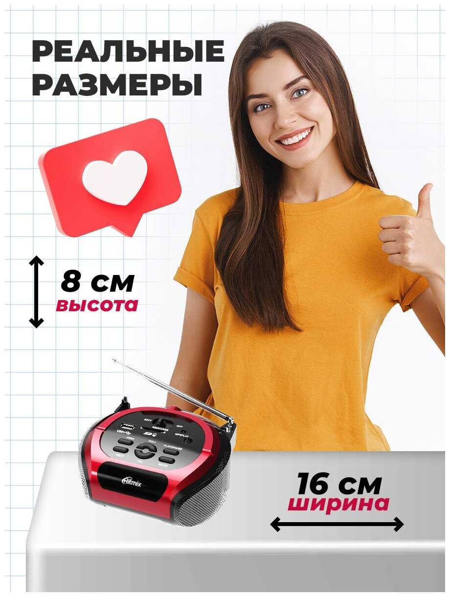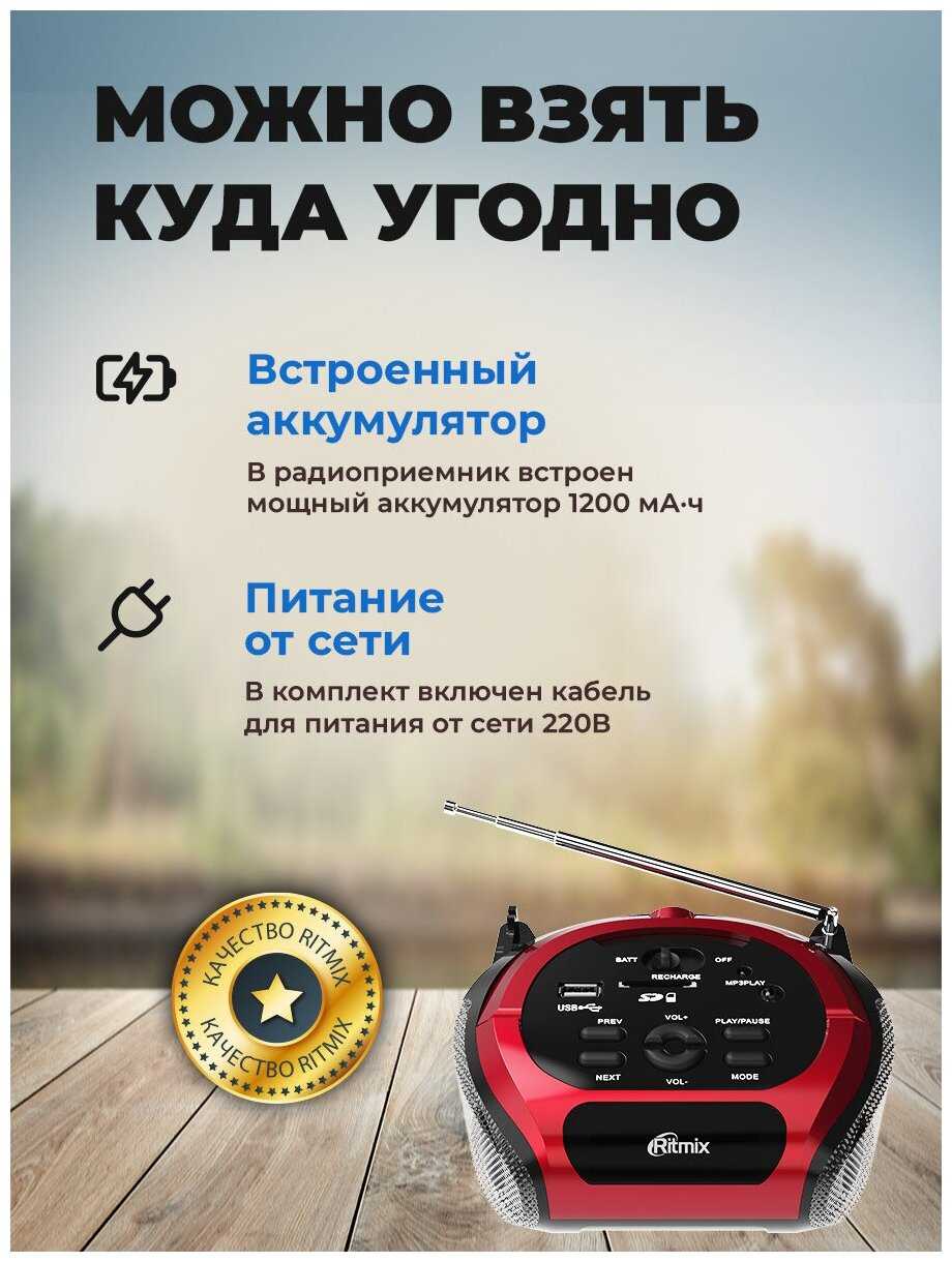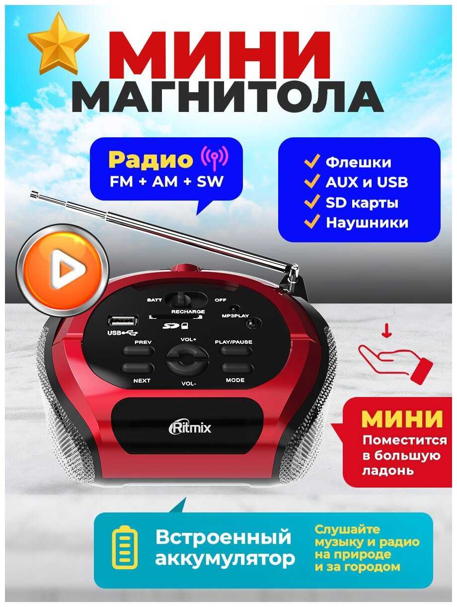 Купил на дачу Магнитолу Ritmix RBB-010 BT из-за радио, но радио не ловит, только если держать антенну рукой, то одну волну может и поймает. В душевой кабинке встроенное радио ловит и то лучше и больше станций. Покупал данную магнитолу на 90% из-за радио. Также был удивлён из-за отсутствия шкалы диапазона радио, есть только кнопки поиска Вперёд и Назад, какую он станцию поймает - не определить сразу. Если вставить флэшку, то радио за ручку уже нести нельзя, иначе ручкой можно сломать флэшку. С флэшки достаточно громко воспроизводит звук, но на предельной мощности не получится слушать - начинает хрипеть, хотя на предпоследнем уровне будет достаточно громко уже. Работает как от сети, так и продолжительное время от встроенного аккумулятора. Очень не хватает Блютус данной модели.