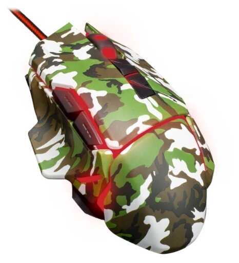 Игровая мышь в расцветке хаки. Размер средний, не маленькая. Держать её не очень удобно. Не хватает игровых кнопок. Зато расцветка классная — на такой мыши не будет видна грязь. Мышь сделана из пластика, шнур нужной длины