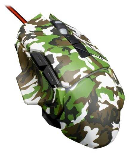 Игровая мышь в расцветке хаки. Размер средний, не маленькая. Держать её не очень удобно. Не хватает игровых кнопок. Зато расцветка классная — на такой мыши не будет видна грязь. Мышь сделана из пластика, шнур нужной длины
